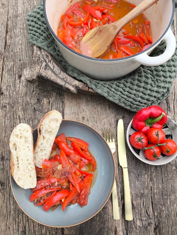 Die Paprikastreifen zugeben und 3-4 Minuten anschwitzen.